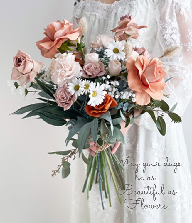 祝福の日を記憶に刻む色褪せないアーティフィシャルフラワーで生花のようなナチュラルエレガントなウエディングブーケをお届けいたします。花嫁さまのお好みやドレス、式場のイメージなどを丁寧にヒアリングしながら全てオーダーメイドでお作りいたします。